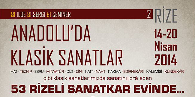 “ANADOLU’DA KLASİK SANATLAR” adı ile, “81 İlde 81 Sergi 81 Seminer” Projesi'nin ikincisi, 14-20 NİSAN 2014 tarihinde Rize’de yapılacaktır. Bu tarihler içinde Turizm Haftası ve Kutlu Doğum Haftası olması münasebetiyle, Rize Valiliği himayesinde, Rize İl Müftülüğü, Rize İl Kültür Turizm Müdürlüğü, Ebruli Yaşam ve Sanat Derneği tarafından ortaklaşa bir organizasyon yürütülecektir. Ülkemizin muhtelif yerlerinde ikamet eden, hat, tezhip, ebru, minyatür, cilt, çini, katı’, naht, sedef kakma, kalemişi, edirnekari, ve kündekari gibi klasik sanatlarımızı icra eden 53 Rizeli sanatkarın katılımıyla, “53 RİZELİ SANATKAR EVİNDE” adı ile Rize’de bir dizi program gerçekleştirecektir. Birinci Program: 14 Nisan 2014 Pazartesi günü saat 11:00’da İsmail Kahraman Kültür Merkezinde, 53 sanatkârımızın hazırladığı, bir sergi ve Hattat Ahmet Zeki Yavaş hocamızın oturum Başkanlığında, Müzehhibe, Nilüfer Kurfeyz ve Prof. Dr. Çiçek Derman hocalarımızın sunacağı, “Klasik Sanatlarımız, Tezhip Sanatı ve Usta Çırak İlişkisi Üzerine” konulu seminer yapılacaktır. İkinci program: 15 Nisan 2014 Salı, saat: 12:00’da Çamlıhemşin, Zilkale’de Klasik Sanatlar Sergisi ve Prof. Dr. M. Zeki Kuşoğlu hocamızın sunacağı “Klasik Sanatlarımız” konulu seminer yapılacaktır. Üçüncü Program: 17 Nisan 2014 Perşembe, saat: 11:00’da, Çayeli Senoz Çukurlu Hoca Medresesi’nde, Kur’an-ı Kerim dinletisi ve Sergi açılış programı yapılacaktır. Ayrıca; program kapsamında, beş gün boyunca, 53 sanatkarımız ve Rize ilinden katılım sağlayan gurupla, sayın Valimiz’in eşliğinde, Rize Müzesi, Rize Kalesi, Ziraat Çay Bahçesi, , Rize Türk Telekom Güzel Sanatlar Lisesi ziyareti, Fırtına Vadisi, Çat Köyü, Pileki Mağarası gibi mekanları kapsayan, kültür sanat gezileri ve sohbet programları yapılacaktır.